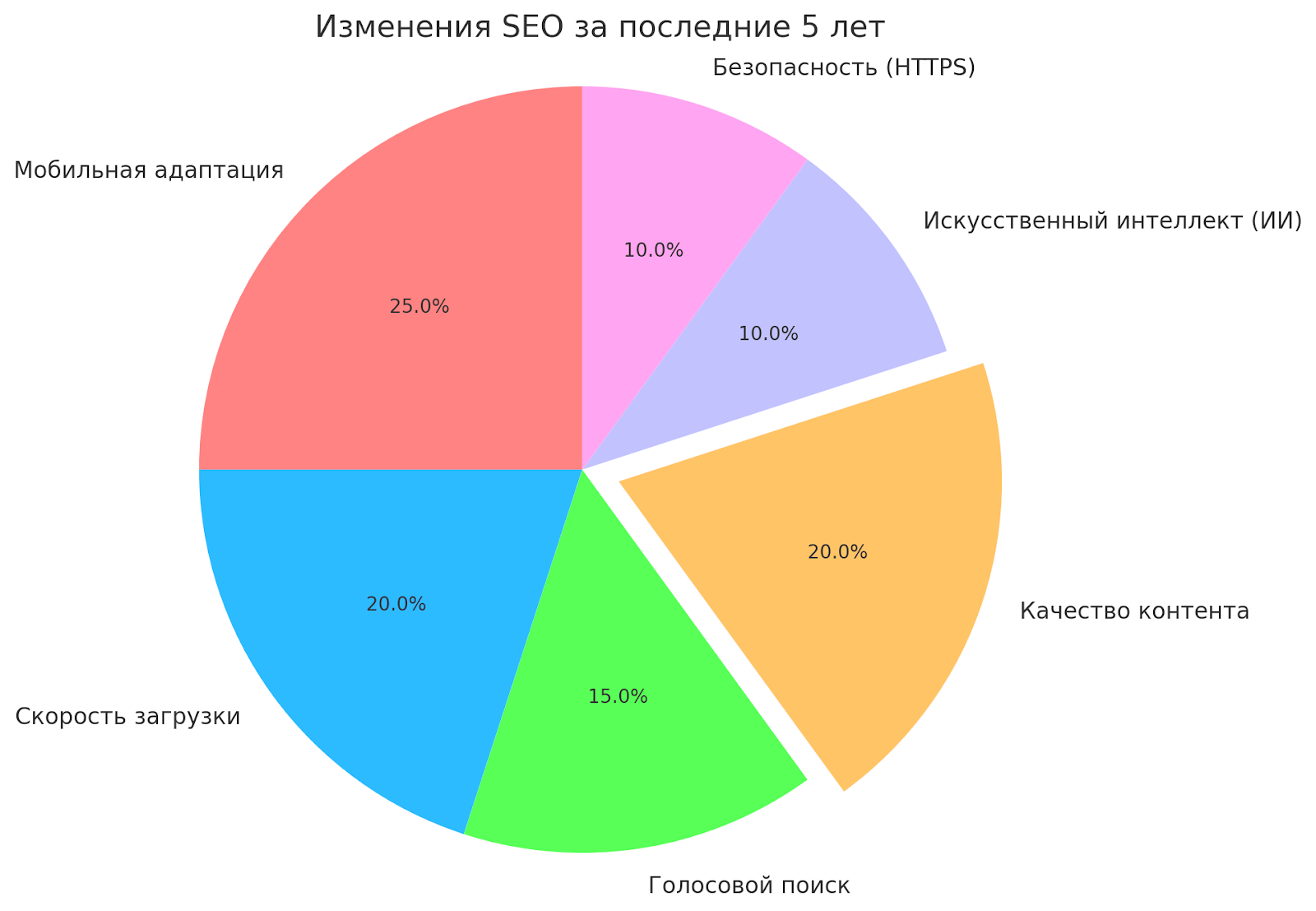 Вот диаграмма, которая демонстрирует изменения в SEO за последние 5 лет. В ней представлены ключевые факторы, такие как мобильная адаптация, скорость загрузки, голосовой поиск, использование искусственного интеллекта и безопасность, каждый из которых играет важную роль в современных стратегиях SEO.