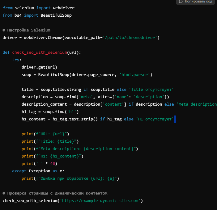 Динамические сайты: С использованием Selenium можно проверять даже те сайты, которые загружают контент через JavaScript, что делает аудит более точным.